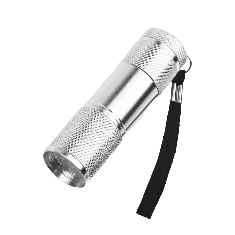 This metal flashlight features 9 bright white LED lights, and includes a wrist strap (around 3”) attached to keep on hand. The LED lights provides amazing bright beams for power outages and other dark conditions. The rubber on/off switch at base controls the operation of the flashlight. Includes AAA batteries inserted. Customize an imprint of your logo on the flashlight to create to a promotional item that will improve your band exposure!