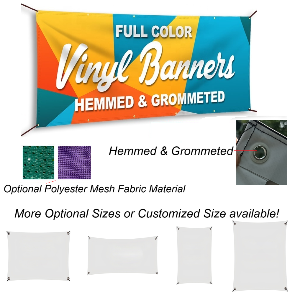 This banner is made from 13-oz vinyl with a glossy finish. It measures 3 feet x 6 feet. Size customization is also available. It is designed with brass grommets at each corner and spaced along the top and bottom. The edges are hemmed for extra durability. Print your business logo, advertising slogan, or custom artwork in full color on this banner to create a biggest, most attention-grabbing display what your business does!