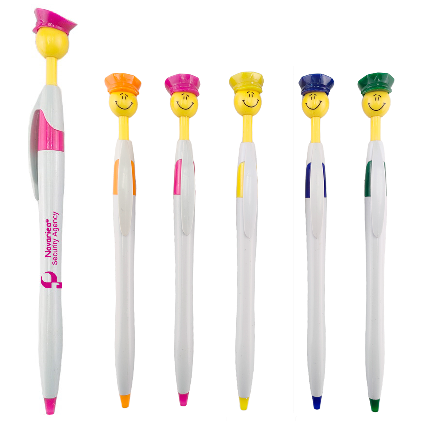This pen is designed with white barrel and colored trim. It features a yellow smiley face with a matching-colored police hat on its head that acts as the plunger. Great for police department, security agencies, anti-drug campaigns, crime prevention activity and so much more. Personalize this pen by adding your logo on the barrel or clip to leave an impression of your brand!