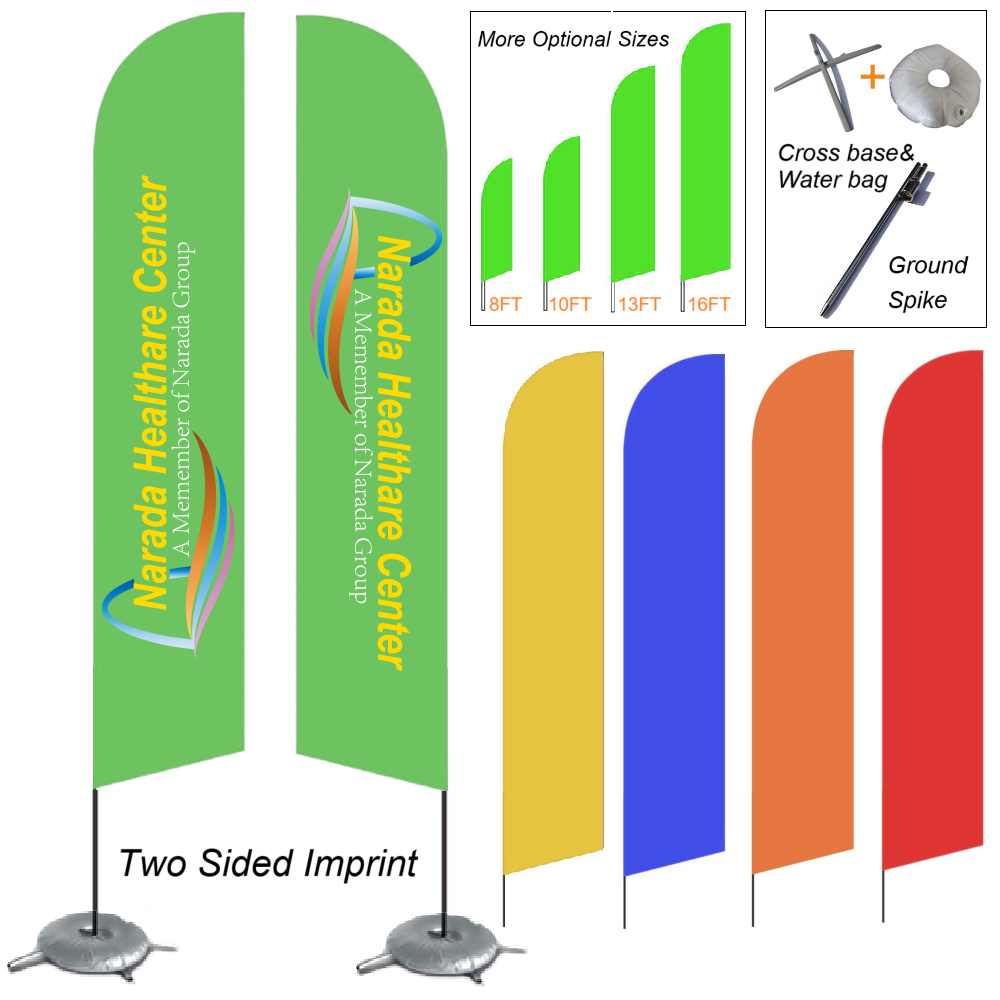 Make your display outstanding with these imprinted blade sail signs. The sign is made of polyester, that can be printed both on the front side and back side. It is designed to spin freely and will rotate with wind. It is great to grab people’s attention with them. The base can be ground spike or steel cross base with extra water bag. The sail signs are available in 4 sizes of 8FT, 10FT, 13FT and 16 FT for choices. Customize an imprint of your graphic on these signs to get your display promoted!