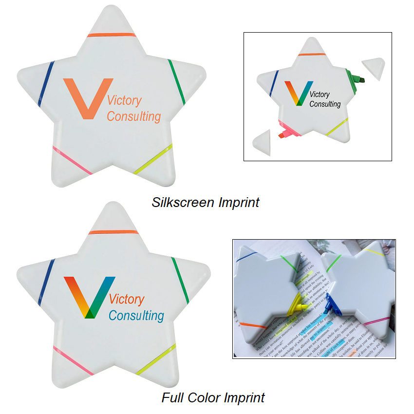 Let your customers mark important words or things on their documents by using this imprinted star-shaped highlighter. It features five bright neon colors, that are in green, blue, orange, yellow and pink. Personalize this star shaped penlight by imprint your logo or graphic with silkscreen imprint or full color imprint to create a unique way to highlight your brand and business!