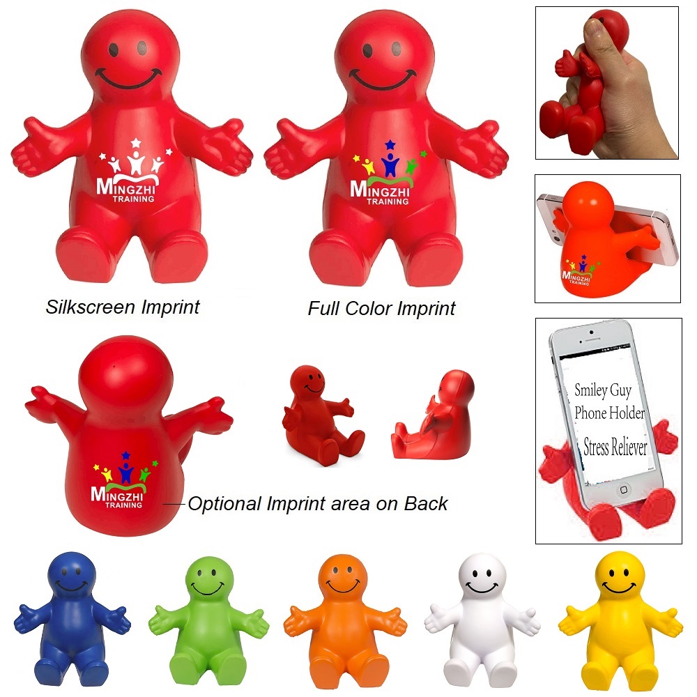 This cute and happy human-shaped cellphone holder is made of polyurethane foam. The little hands and feet form a versatile phone stand for most kinds of cellphones. The phones will lie down right in the lap of this smiling phone holder. The holder can display devices in horizontal or vertical positions for easy desktop viewing all day. Customize an imprint of your logo info on the belly or the back of the holder for your next promotional campaign to create a cute and friendly item that is sure to put on smile on the receipts’ face.