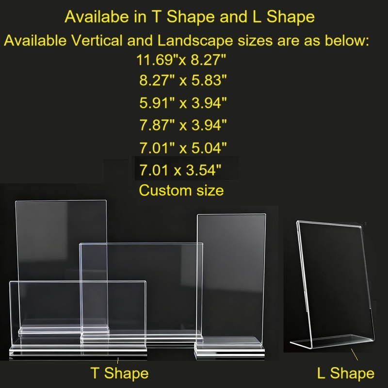 Let your customers draw attention to their booth or display by using this clear acrylic tabletop frame. This tabletop frame is made of acrylic, and features a solid base. You can simply insert your preferred picture, a flyer, advertisements, brochure, handout, and so much more into this tabletop frame. It is great for tradeshows, hospitals, reception areas, office, restaurant, hotel, and so much. They are available in a wide variety of sizes for choice. You can also personalize this tabletop frame by imprinting your brand or graphic by silkscreen or full color imprint on the base or on the front of the frame.