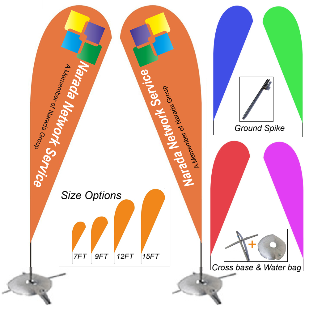 Make your display outstanding with these imprinted teardrop flags. The teardrop flag is made of polyester, that can be printed both on the front side and back side. It is designed to spin freely and will rotate with wind. It is great to grab people’s attention with them. The base can be ground spike or steel cross base with extra water bag. The teardrop flags are available in 4 sizes of 7FT, 9FT, 12FT and 15 FT for choices. Customize an imprint of your graphic on these flags to get your display promoted!